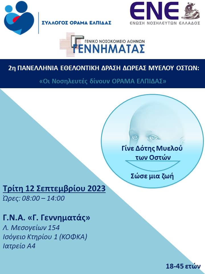 Το νοσοκομείο μας συμμετάσχει στην 2η Πανελλήνια Εθελοντική Δράση Δωρεάς Μυελού Οστών: «Οι Νοσηλευτές δίνουν ΟΡΑΜΑ ΕΛΠΙΔΑΣ», που συνδιοργανώνουν η Ένωση Νοσηλευτών Ελλάδος και ο Σύλλογος «ΟΡΑΜΑ ΕΛΠΙΔΑΣ».